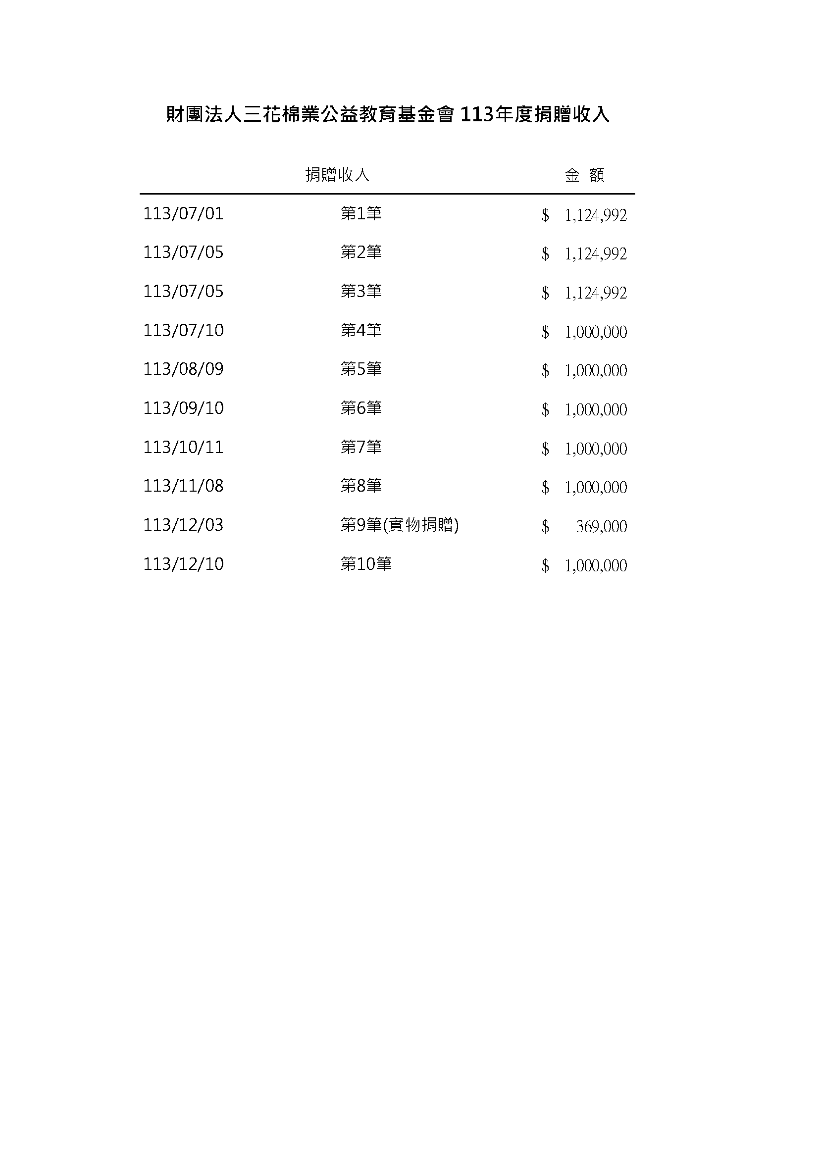 財團法人三花棉業公益教育基金會 113年度捐贈收入